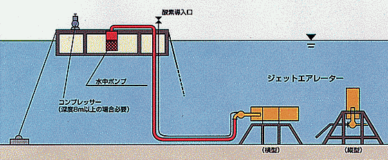 閉鎖水系・海域では総じて水の酸欠に起因した水質悪化・腐敗が進行します。特に夏期には表層に高温で安定的な成層が形成され、低層への酸素供給が満足に出来ずに水質悪化を促進。「MJA」はポンプの圧力水をジェット流にして真空を発生、自然吸引した空気と水を撹拌・混合して高速噴射する「混気ジェット流」本来の特長をベースにしています。溶存酸素濃度の高い表層の水を駆動水として低層にジェット水流を送るため、自然な形で水全体に適度な酸素が供給されます。